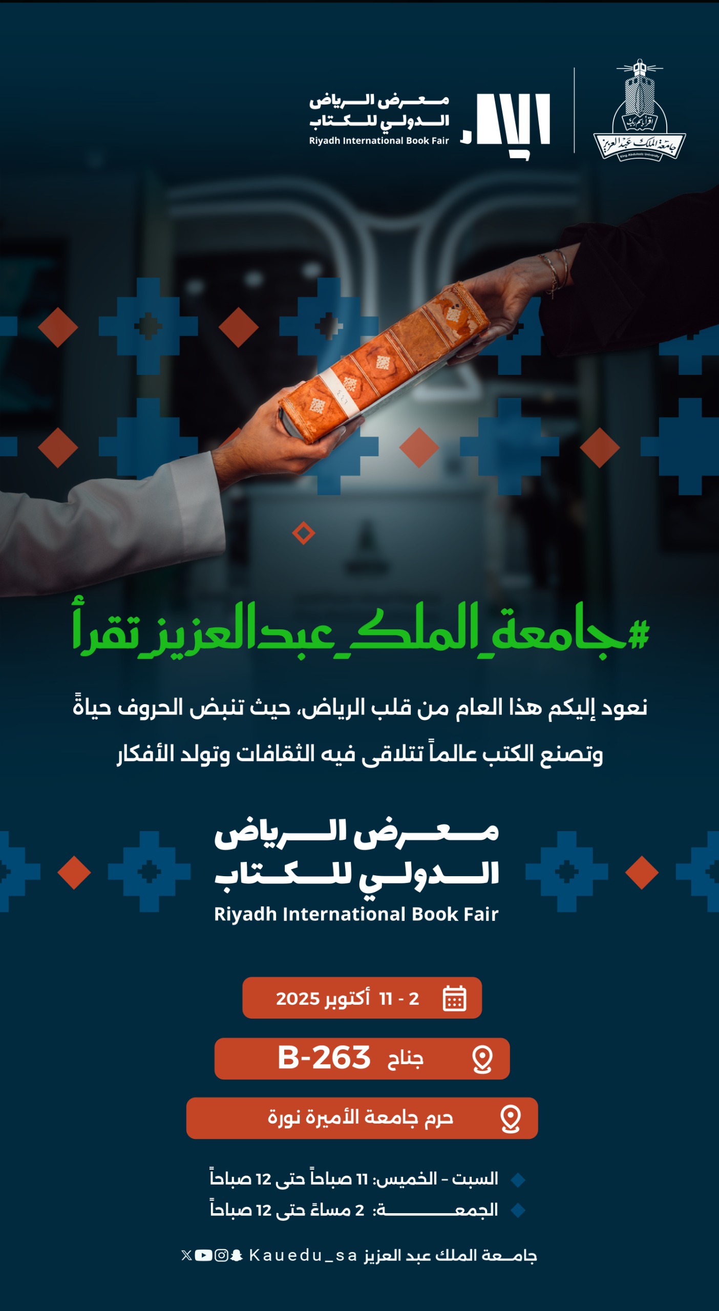 تشارك جامعة الملك عبدالعزيز في معرض الرياض الدولي للكتاب، من خلال جناح تعريفي يستعرض أبرز إصداراتها الأكاديمية والعلمية، إضافة إلى مبادراتها البحثية والثقافية، بما يعكس دورها الرائد في خدمة المعرفة والمجتمع وتعزيز الحراك الثقافي الوطني.